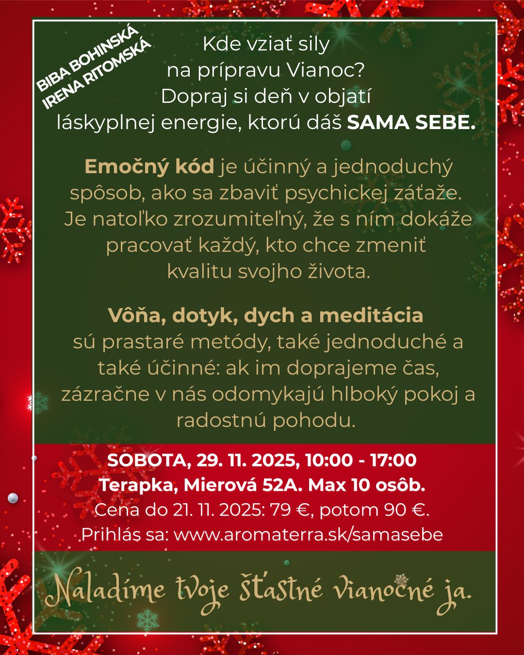 Po tomto dni prídeš domov oddýchnutá, s novými silami a ako bonus - rozjasnenou pleťou, lebo budeme robiť aj meditáciu pre krásu :). Naučíš sa tri jednoduché, časovo nenáročné metódy, ktoré budeš môcť používať denne pre svoje duševné a fyzické zdravie.