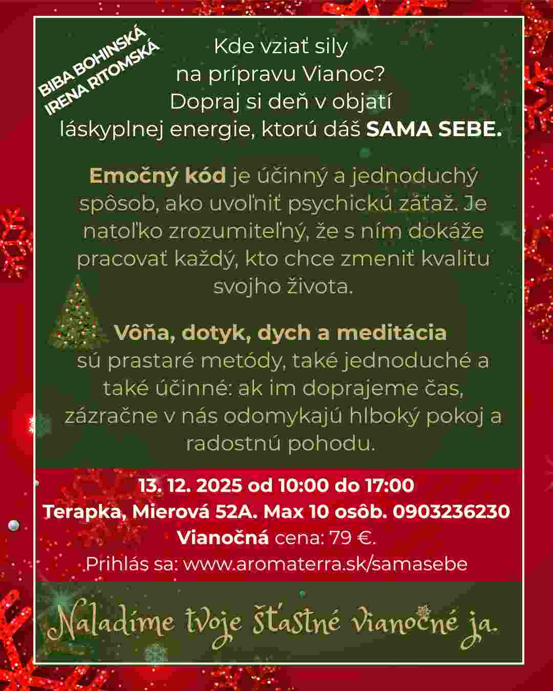 Po tomto dni prídeš domov oddýchnutá, s novými silami a ako bonus - rozjasnenou pleťou, lebo budeme robiť aj meditáciu pre krásu :). Naučíš sa tri jednoduché, časovo nenáročné metódy, ktoré budeš môcť používať denne pre svoje duševné a fyzické zdravie.